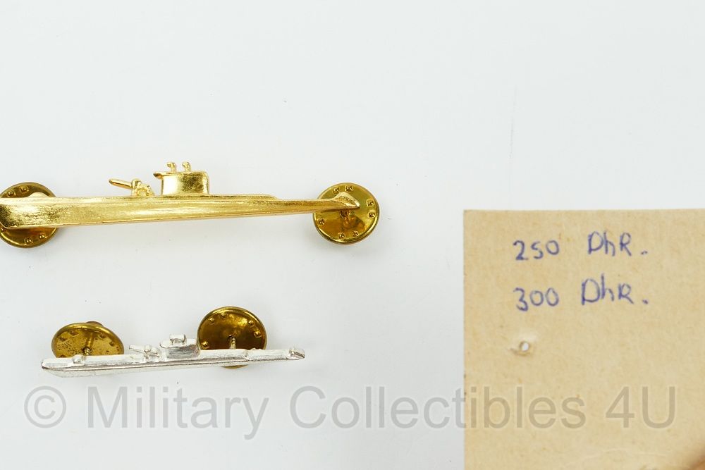 Dit is een originele set van 2 spelden van Griekse Marine duikboten, 1 goudkleurige en 1 zilverkleurige.
