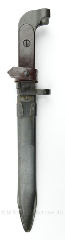Dit is een originele bajonet voor een Bulgaarse AK-47 met bijpassende metalen schede met lederen band.