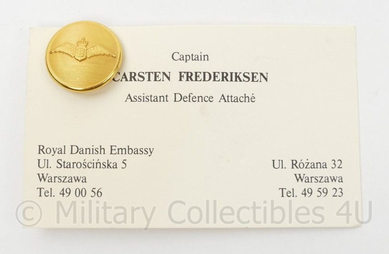 Dit is een origineel visitekaartje van de Deense Defence attache, versierd met een knoop.