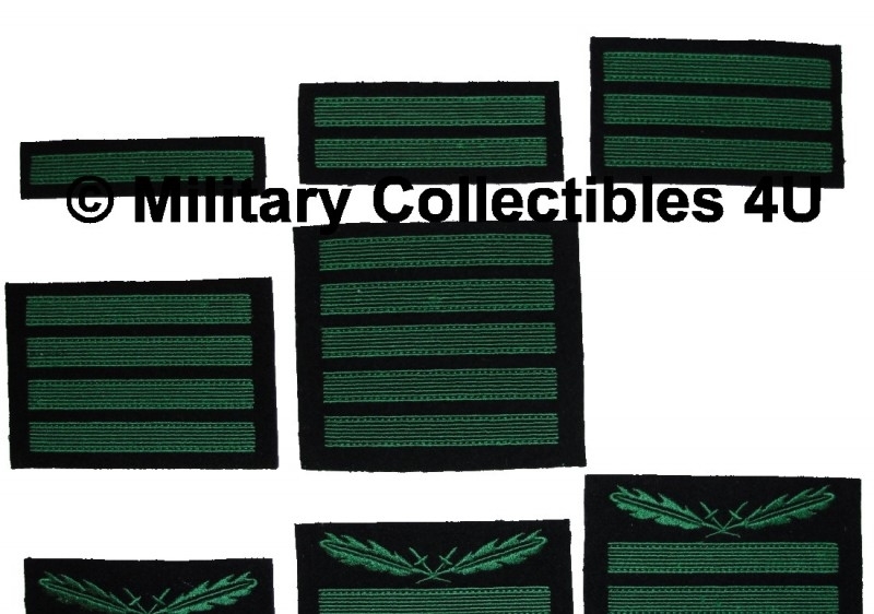 De achtergrond is van zwart filt, zoals het hoort. Voor officieren was de rang zelf groen en voor voor Generalen goudgeel. Ze hebben exact het goede formaat. Namelijk 9-10 cm breed.