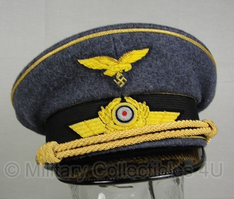 Dit is een exact nagemaakte Luftwaffe schirmmutze voor Luftwaffe generaals. Deze petten hebben een gouden rand. De emblemen zijn van echt goudkleurig metaaldraad gestikt. De insignes zijn handgemaakt.