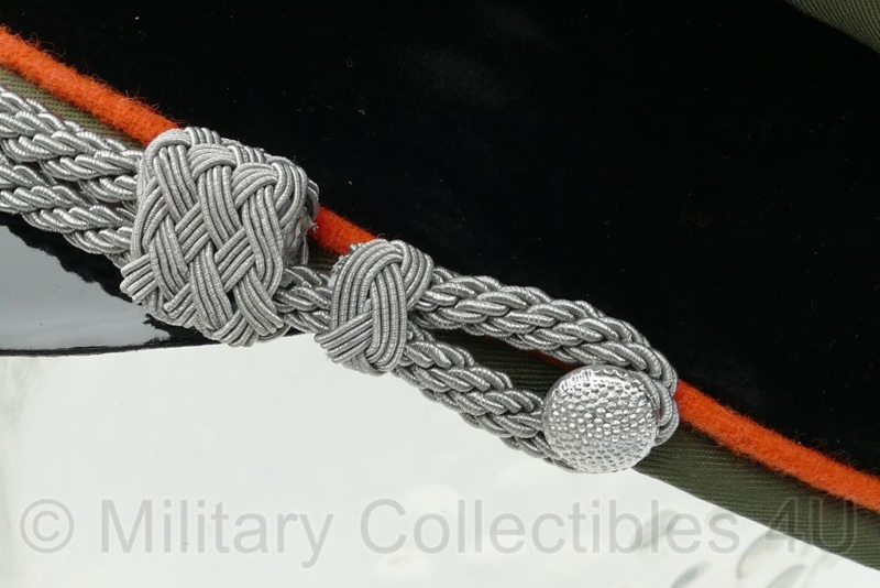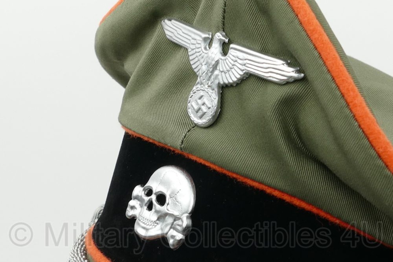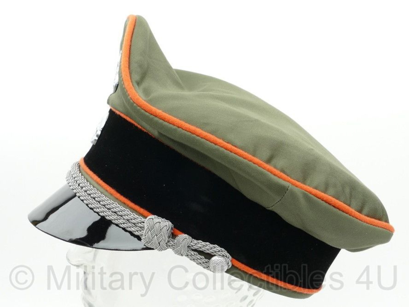 Dit is een exact nagemaakte universele Waffen SS schirmmütze voor officieren. De pet heeft achter de doodskop de brede fluweel achtige rand en de oranje bies wil zeggen dat hij voor Polizei officieren is. De stof is van feldgrau gabardine.
