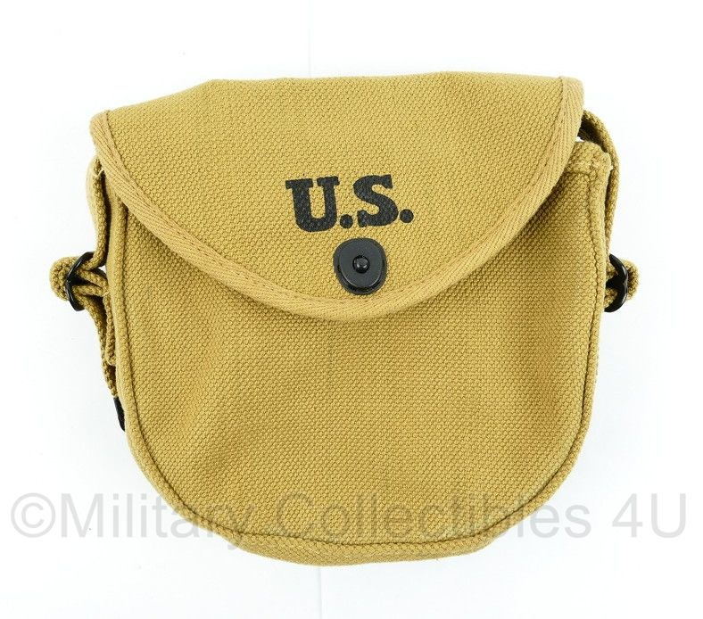 Thompson Ammunition Pouch met draagriem Case Cal .45 SUB MG D90242Dit is een nagemaakte tas die bedoeld was om extra munitie voor de thompson mee te nemen. Er konden zowel magazijnen in als doosjes munitie.