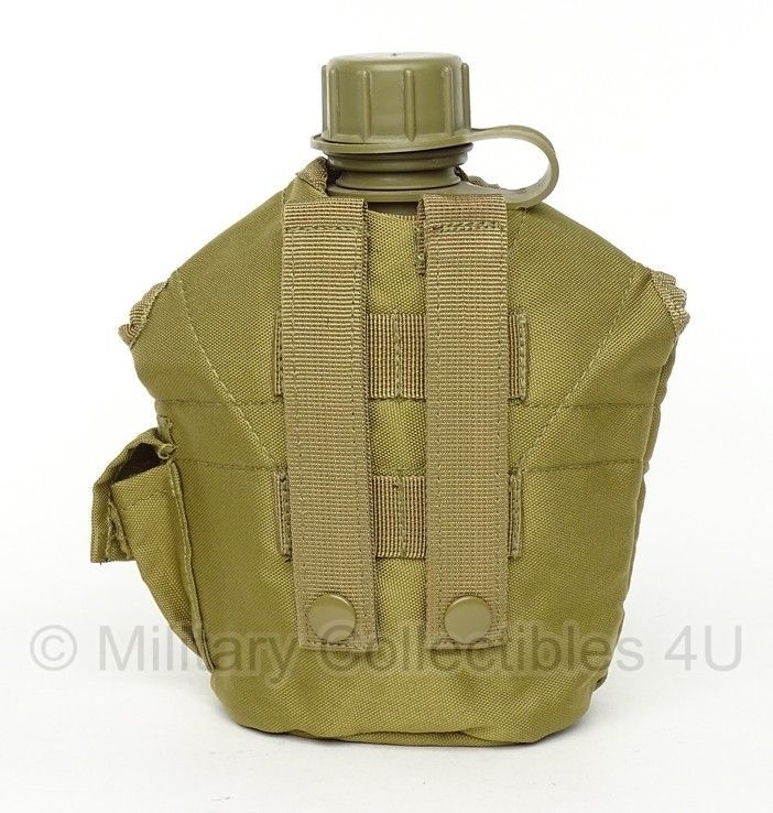 Dit is een losse US Army style veldfles hoes. Hij heeft de bevestiging achterop voor het MOLLE draagsysteem. Hij past ook aan een gewone koppel. De hoes sluit met klitteband.