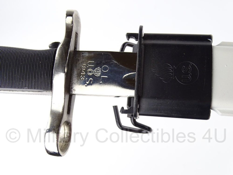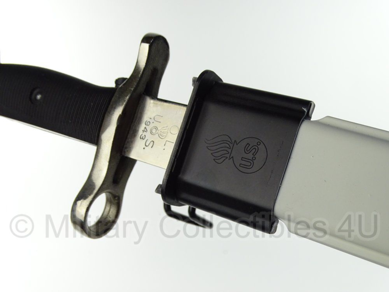 Dit is een mooie replica WO2 US M1 Garand bajonet. De Bajonet is gestempeld op het lemmet met o.a. US 1943 en ook de schede is gestempeld.