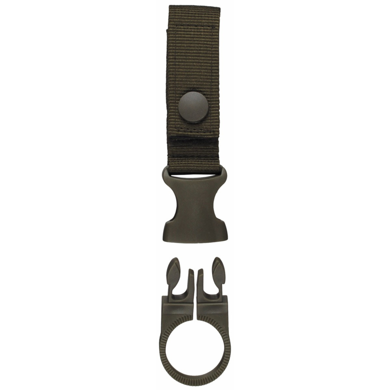 Dit is een nieuw gemaakt draagstel voor een fles. Je kunt hem aan je koppel, rugzak of uitrusting hangen.