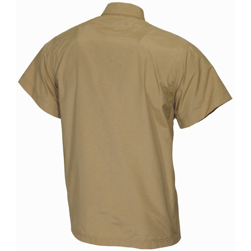 Dit is een nieuw gemaakt khaki overhemd, met korte mouwen. Dit overhemd heeft twee borstzakken (klep met knoop) en zichtbare knopen. Aan de onderzijde van een van de borstzakken zit een elastische lus.