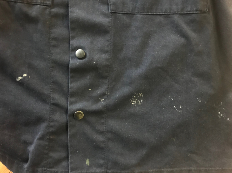 Dit is een originele huidig model basis jas van de Koninklijke Marine. De jas is in normaal gebruikte staat, maar met lichte verfvlekken (zie foto). Aan de binnenzijde zit het originele label. De maat is 6080/9095, oftewel voor een totale lengte van 160-180 cm en een borstomtrek van 90-95 cm.