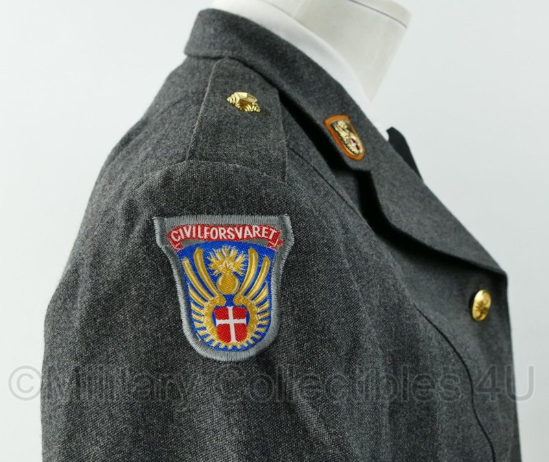 Op de jas zitten de originele kraaginsignes en er zit een civilforsvaret embleem op de mouw.
