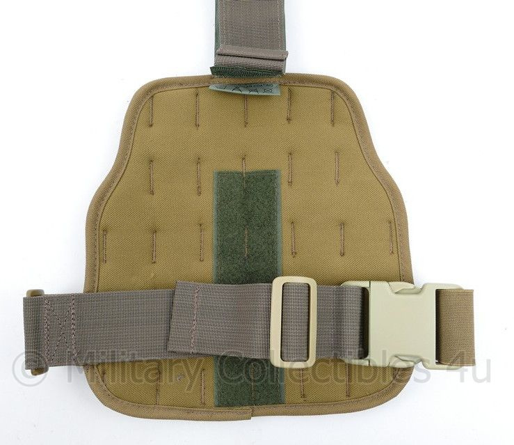Dit is een oriigneel beenpaneel in Coyote van Defensie. De afmeting is 24 x 54 cm. Door middel van het MOLLE systeem zijn er bijvoorbeeld makkelijk tassen aan de bevestigen. De banden zijn elastisch.
