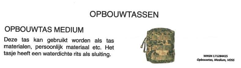 Article number: 31x BSLG25(was E1-2.5.1) 6049990Dit is een originele NFP camo Opbouwtas medium Voss.