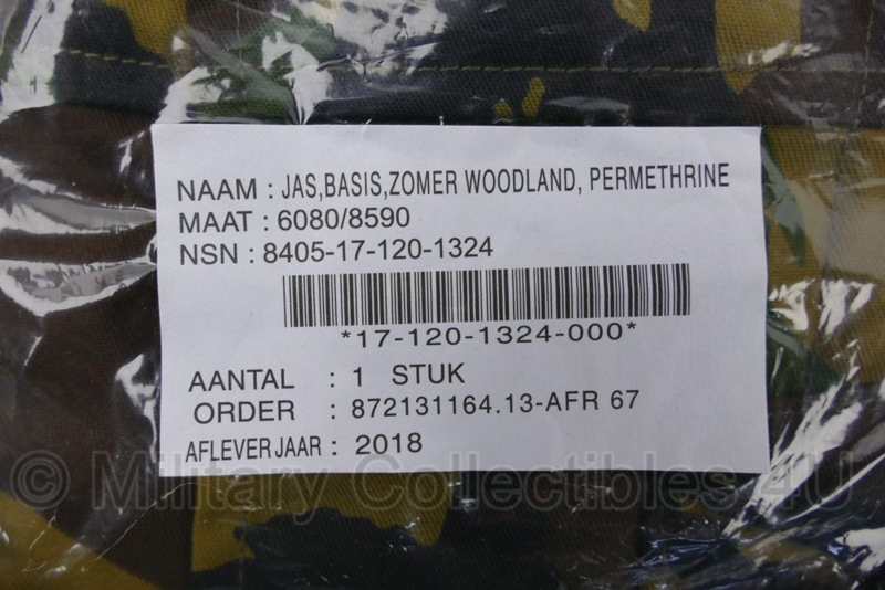 Dit is een originele zomer basis jas van het Nederlandse leger uit 2018. De jas is nog helemaal nieuw en zit in de originele verpakking. Hij is behandeld met permethrine en is hierdoor insekten- en tekenwerend. Dat is zeldzaam bij woodland basis jassen.