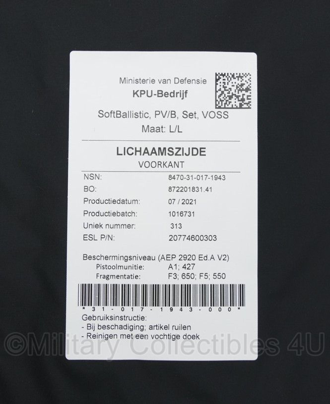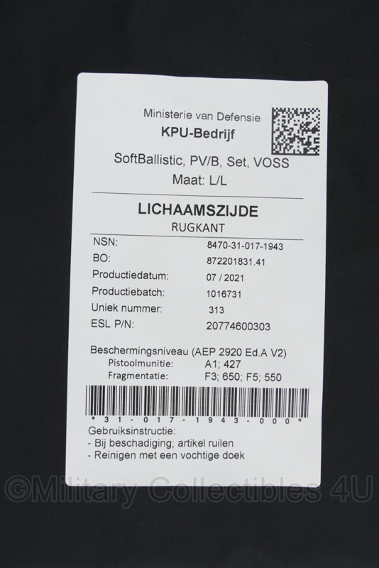 Defensie Protectievest SoftBallistic PV/B Set Voss inhoud voor NFP Scherfvest en vest B - maat Small, Medium Long of XXL/L - origineel