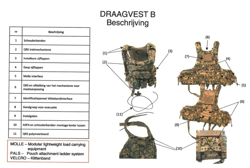 vest B is een vest uitgevoerd in het NPF-Multitone. Het is rondom uitgevoerd met webbing, waardoor het als platform dient voor alle opbouwtassen en andere artikelen met een Molle-systeem. Het vest is een zogeheten all-in-one vest en heeft een Quick Release (QR)-systeem, zodat het met 1 handeling afgeworpen kan worden. De QR-hendel zit aan de voorkant op borsthoogte.