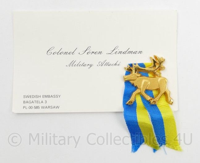 Visitekaartje van de Swedish Embassy Defence attache met speld - origineelDit is een origineel visitekaartje van de Attache van de Zweedse Ambassade. Op het kaartje zit een speld.