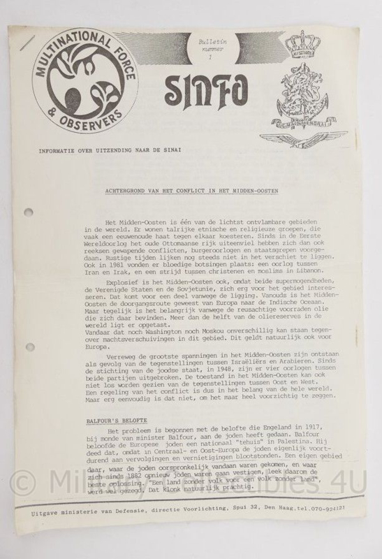 Sinfo Bulletin nummer 1 Sinaï missie Kmarns en Kmar Multinational Force & Observers- origineelDit is een origineel Sinfo Bulletin nummer 1 van de Sinaï missie van de Kmarns en Kmar.